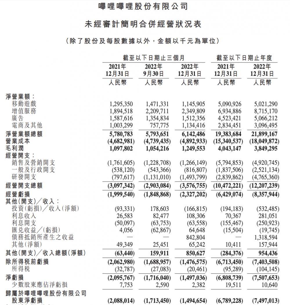 B站日前發(fā)布了2022年第四季度以及全年的財報,根據(jù)財報可看到b站在第四季度總營收為61億元,2021年同期相比有6%的增長,凈虧損達到15億元。與2021年同期凈虧損相比,有29%的減少,2022年總營收219億元,同比有13%的增長,凈虧損從2021年的68億一直擴展到了75億元。