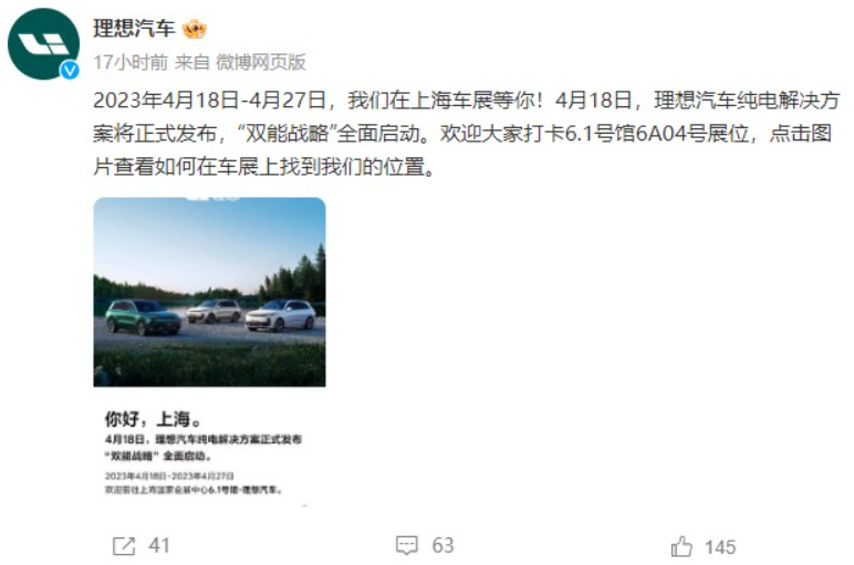 理想汽車官方發布消息表示將在4月18日發布純電動汽車的解決方案,還將會參加在4月18日到27日舉行的上海車展,據了解現在理想正在致力于兩種純電動車的開發,公司還表示從2023年起,每年都會推出兩款高壓純電動車型。