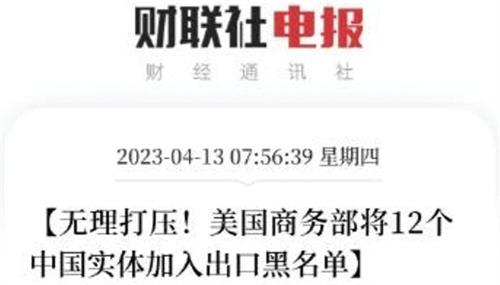 4月13日,美國商務部和安全局無理打壓并將12個中國實體公司加入到黑名單中。美國商務部工業與安全局在當地時間周三的聯邦公報刊登一份于4月17日發布的行政措施,其內容是將12個中國香港與內地的實體加入到進出口管制清單中,理由是這些公司支持俄羅斯軍方。