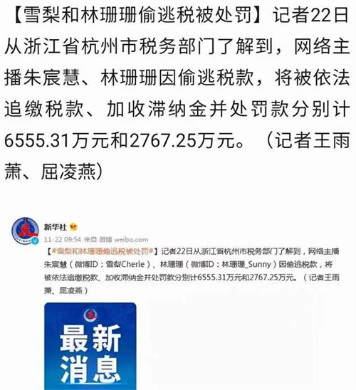 雪梨1990年出生,畢業(yè)于浙江工商大學(xué),在新西蘭奧克蘭大學(xué)留學(xué),除了有網(wǎng)紅身份之外,最大的標(biāo)簽是王思聰前女友。2021年11月22日,國(guó)家稅務(wù)總局杭州市稅務(wù)局發(fā)布公告稱:通過(guò)稅收大數(shù)據(jù)分析發(fā)現(xiàn)雪梨以及林珊珊兩名網(wǎng)絡(luò)主播涉嫌偷逃稅款,并依法對(duì)兩人追繳處罰共計(jì)超9,300萬(wàn)。對(duì)雪梨追繳稅款加收滯納金并擬處一倍罰款共計(jì)6555.31萬(wàn)元。
