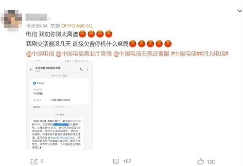 8月14日,中國電信雙倍扣除用戶費(fèi)用的相關(guān)話題快速登上熱搜榜。有網(wǎng)友爆料河北電信在8月14日凌晨期間突然扣費(fèi),扣費(fèi)的金額是用戶當(dāng)月套餐的雙倍費(fèi)用。有網(wǎng)友評論自己的話費(fèi)被多扣260塊錢,現(xiàn)在的余額顯示為0。也有網(wǎng)友表示剛充的話費(fèi)全部被扣完,讓中國電信出來做個(gè)解釋。有的網(wǎng)友在收到被扣費(fèi)短信之后,撥打中國電信的人工客服幾十遍也打不通。