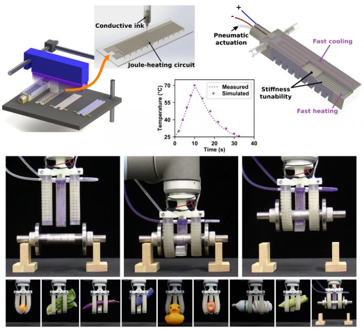 為了證明他們方法的成功,該團隊設計了一個帶有三個FRST執行器的機器人抓手,可以抓住和提升任意形狀的物體,各種重量從不到10克到1.5千克,Ge說。他補充說,他們使用計算模型來模擬FRST執行器的機械和熱電行為,以指導其設計并提供增強負載能力的見解。