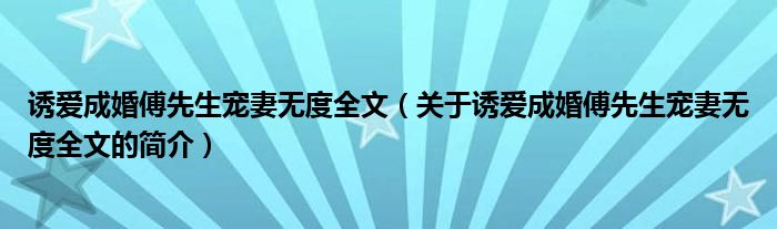 大家好,誘愛成婚傅先生寵妻無度全文,關于誘愛成婚傅先生寵妻無度全文的簡介很多人還不知道,現在讓我們一起來看看吧!