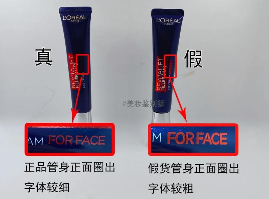 再有一點(diǎn)就是看這個歐萊雅紫熨斗眼霜的 logo,真假眼霜的包裝盒上都有燙金的歐萊雅品牌標(biāo)志,但是真的眼霜包裝盒上的品牌標(biāo)志的燙金紋路是非常細(xì)的,問題也很小,品牌的字母,用手摸起來會有些許的顆粒磨砂感,假眼霜的品牌標(biāo)志摸起來比較粗糙,而且燙金紋路也非常的粗略,品牌的標(biāo)志字母,沒有磨砂感,還非常的光滑,在燈下還會出現(xiàn)反光,其次就是查看眼霜的蓋子,正品的眼霜蓋子呈階梯形的形狀,而假冒的眼霜內(nèi)部折成三角形。