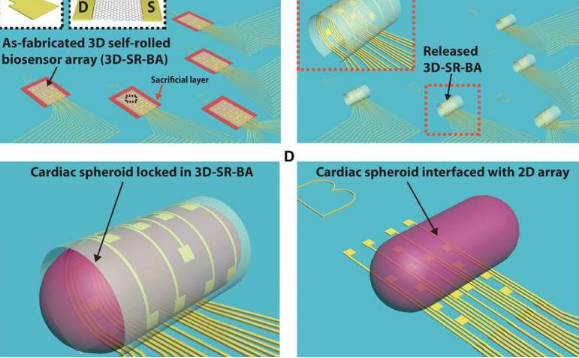 對于目前的戰略,研究團隊開發了一種三維電子生物傳感器的受控組件,其中預應力金屬/聚合物支撐多層系統作為工作平臺。研究團隊在平面上設計了自動滾動平臺,當從表面釋放時,實現了受控的三維幾何形狀。他們使用該方法研究了干細胞衍生的工程化心臟細胞組件中電信號的傳播。該系統是理解三維球體系統中細胞 - 細胞通信過程的理想選擇。