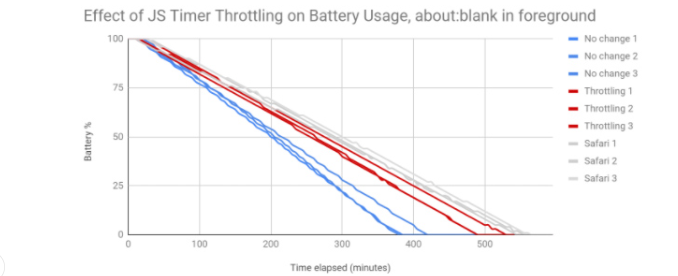 Canary中的標志鏈接到大量文檔,其中詳細介紹了使用此新功能的Google測試運行。對于第一次測試,該公司抓住了2018年的15英寸Macbook Pro,并加載了36個帶有空白前景選項卡的背景選項卡,然后讓筆記本電腦運行直至其死亡。在節流的情況下,筆記本電腦的持續時間比默認設置長了兩個小時,或28%。這是一個巨大的進步,但仍無法使Chrome達到蘋果Safari的水平,后者在默認設置下將Chrome擊敗了三個小時,在新的限制條件下勝過了一個小時。