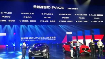 價格方面,E-PACE官方指導價28.88萬元,E-PACE S指導價為32.38萬元,E-PACE首發限量版指導價為34.38萬元,E-PACE S指導價為34.58萬元,E-PACE SE指導價為37.68萬元,E-PACE HSE售價39.58萬元。