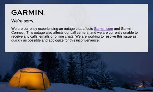 到目前為止,Garmin對(duì)此事件只字未提。網(wǎng)站上的標(biāo)語上寫著:“我們目前正在遭受影響Garmin.com和Garmin Connect的停機(jī)。中斷也影響了我們的呼叫中心,我們目前無法接聽任何電話,電子郵件或在線聊天。我們正在努力盡快解決此問題,對(duì)于由此帶來的不便深表歉意。”
