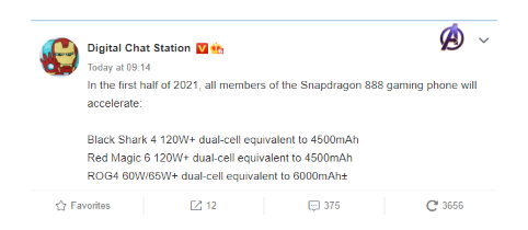 根據數字聊天??站的說法,ROG Phone 4將支持60W或65W的快速(有線)充電。這應該使用戶能夠為其雙電池6000mAh的電池充電,而其前身ROG Phone 3支持30W快速有線充電。
