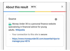 如果該網站沒有Wikipedia描述,則用戶將看到可用的其他上下文,例如Google首次將該網站編入索引時。在查看工作清單或本地公司等其他內容時,用戶將看到有關Google如何從網絡上的站點或以有用的格式呈現的公司自身中獲取信息的描述。