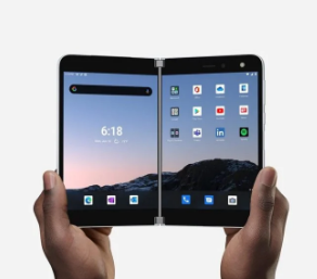 Surface Duo是一款雙屏幕設備,可以像小型筆記本電腦一樣打開。它具有360度的鉸鏈,可以將其完全向后打開,從而允許用戶使用兩個屏幕之一。打開時,兩個AMOLED顯示屏的總尺寸為8.1英寸,分辨率為2700 x1080。每個顯示屏的尺寸為5.6英寸,分辨率為1800 x 1350。
