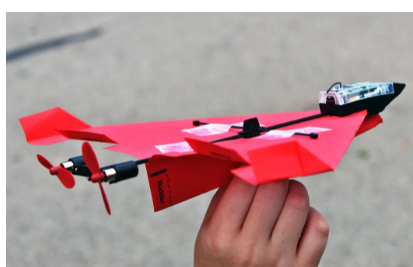 遙控飛機由遙控體和紙飛機兩部分組成。身體支撐著紙飛機和所有電子設備的去向。前面的“駕駛艙”包含電子設備、一個柔軟的、蓬松的鼻子以在它撞擊地面時保護它、開/關開關、天線和固定紙飛機的夾子,以及充電端口。橫梁是塑料的,后面有兩個紅色的推進器。