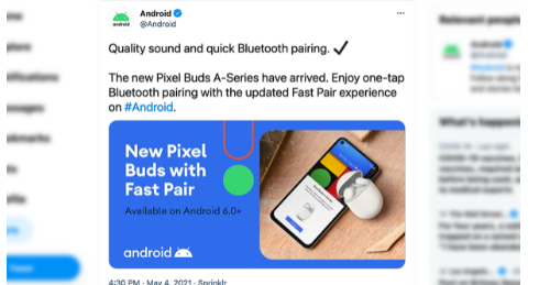 在撰寫(xiě)本文時(shí),Pixel Buds A 在 Google 的網(wǎng)上商店中不可用。這條來(lái)自官方 Android Twitter 帳戶的消息似乎是一個(gè)真正的錯(cuò)誤。盡管如此,它表明 Pixel Buds A 看起來(lái)與標(biāo)準(zhǔn) Pixel Buds非常相似,并且支持在運(yùn)行 Android 6 或更高版本的設(shè)備上一鍵配對(duì)。