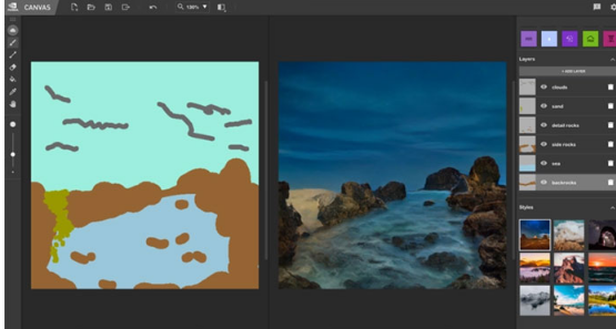 英偉達解釋說,其新的 Canvas 應用程序建立在名為GauGAN的實時繪畫工具之上,該工具由其研究人員開發,并在本次公開測試版發布前的各種貿易展覽會上進行了演示。該藝術工具利用“深度學習模型將粗略的草圖變成令人驚嘆的場景”,就這么簡單,您可以通過觀看電影行業概念藝術家 Jama Jurabaev 的視頻演示來輕松掌握竅門. Nvidia Canvas 很容易被稱為 DLSS Daubing。