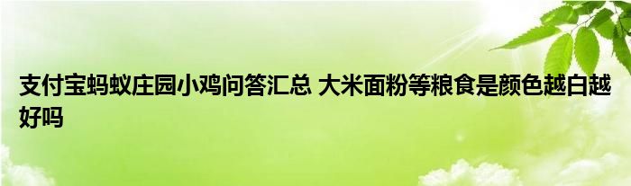 支付寶小雞莊園每日答題的答案是很多小伙伴們現在每天都必做的一件事,為自己的小雞賺取飼料,那么答題的過程當中很多小伙伴就會不知道答案,就好比今日的問題為支付寶螞蟻莊園小雞問答匯總 大米面粉等糧食是顏色越白越好嗎,那么大家不知道答案的情況下要是答錯了就領取不到飼料了,不過這里大家不需要擔心,小編就來給大家收集下支付寶螞蟻莊園小雞問答匯總 大米面粉等糧食是顏色越白越好嗎的答案,下面分享給大家吧。
