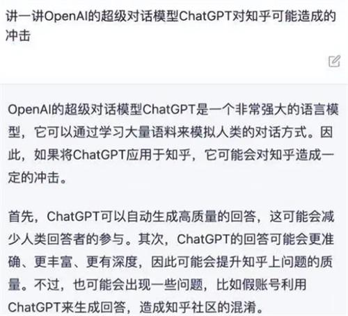 ChatGPT人工智能受到了非常多企業的青睞,相對而言也給一些企業帶來了危機,比如說知乎,對于知乎來講ChatGPT給知乎帶來的危險,遠比要給知乎帶來的機遇要大得多。ChatGPT是一種智能AI聊天機器人,主要是以問答的形式回答用戶,你在搜索框里面輸入一個問題,它就會給出你專業的解答,這種方式也讓很多人想起了,這難道不就是知乎的模式嗎。也有好多人認為它的出現,會對知乎的用戶群體產生龐大的沖擊,很有可能在將來會取代知乎。