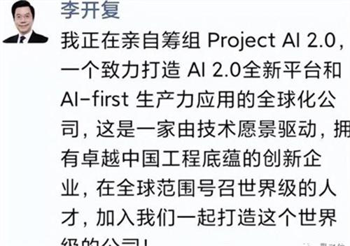 李開富發朋友圈稱要開始籌備新公司,新公司的目標就是大模型領域。發文中,李開復表示正在親自進行 Project AI 2.0的重組,將集中力量建立一個全新的 AI2.0的平臺,進行AI- first生產力應用的實現全球化的公司。新公司將采用的是技術愿景進行驅動,所擁有的中國工程的底蘊將會非常卓越,是一個全新的進行創新的企業。新公司會在全球的范圍內召集人才,希望來自世界各地的高級人才,能夠參與到這個世界級的公司的建造過程中來。