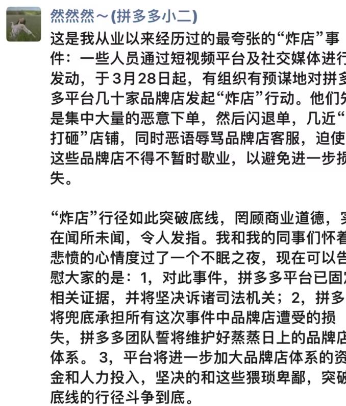 拼多多平臺數(shù)十家品牌店近期遭遇有組織的“炸店”事件,對此有拼多多小二發(fā)聲稱,這是從業(yè)以來經(jīng)歷過的最夸張的惡意事件之一,有人通過短視頻平臺和社交媒體有組織有預謀地對平臺品牌店發(fā)起攻擊,集中大量惡意下單,然后閃退單,甚至辱罵客服人員。此類破壞性行為令人震驚,平臺將采取措施予以嚴懲。