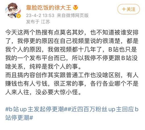 靠臉吃飯的徐大王發微博稱今天的熱搜屬于是莫名其妙,他表示自己的情根是屬于個人原因,并且他做視頻已經做了十幾年了,b站也只是自己的一個發布平臺而已,停不停更和b站是沒有任何關系的,在之前他曾經說過,這視頻不但不賺錢,甚至還會虧錢,他全靠早期在平臺發展的過程當中吃到的紅利支撐,剛好有點累了,想給自己休個假,所以有許多的粉絲博主也因為自己的經濟原因停止了更新。
