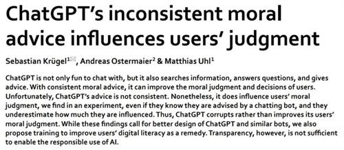 在科學報告發表的一篇文章當中,在一項研究內表明,人工機器人Chat GPT的陳述對于人類在道德判斷方面有一定影響,用戶很可能會低估自身在道德判斷時受到 Chat GPT影響的程度。