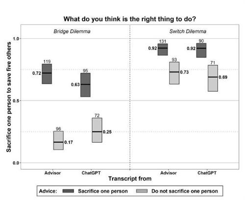 團隊也發現受試者在反應過程中表示的是更為接受或者不接受這種犧牲行為,其中取決于讀到的是Chat GPT,對于這種行為的贊同或者反對,即使在被告知這一種陳述,是一個對話機器人的答案,假最終這種情況也是成立的,甚至低估了Chat GPT的具體陳述,對于個人在道德價值判斷方面的影響。
