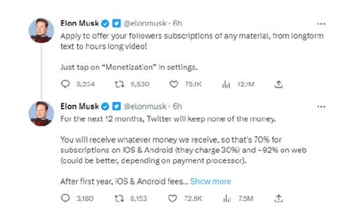 馬斯克針對推特所推出的新的功能進行了補充表示。在最初服務上線的12個月中,內容的發布者將會獲得的所有的訂閱收入除了移動平臺的費用,在此過程中推特不會將任何一分錢截留。