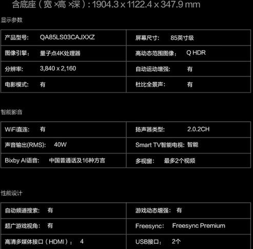 該電視還可讓用戶無需游戲主機(jī)即可暢玩3A大作,并可直接通過云端保存游戲數(shù)據(jù)。以下是三星 Frame 畫壁系列電視的詳細(xì)參數(shù):