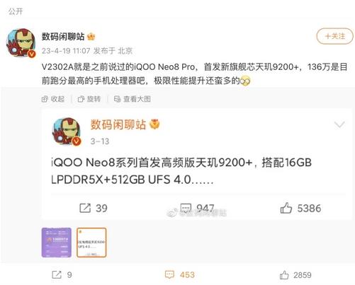 同時,爆料博主 @數碼閑聊站也爆出了這個消息,并稱V2302A就是之前提到的iQOO Neo8 Pro,搭載首發的新旗艦芯片——天璣9200+。數碼閑聊站在爆料中表示,這顆芯片跑分達到了136萬,是目前跑分最高的手機處理器,其性能也將得到極大提升。