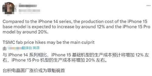 據知情人透露,蘋果iPhone 15 Pro的生產成本相比iPhone 14 Pro增加了20%左右,標準的iPhone 15機型成本也將增加12%左右。考慮到蘋果公司此前的定價策略,不排除新的iPhone 15和iPhone 15 Pro系列機型價格將有所上漲。