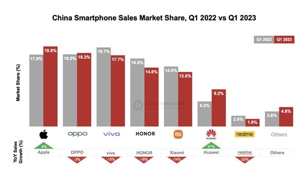 最近Counterpoint Research發布的統計數據顯示,2023年第一季度中國智能手機市場同比下跌5%,但環比增長了10%,市場正在逐漸復蘇。值得關注的是,華為手機銷量相比2022年同期實現了高達41%的增長,總市場份額提升至9.2%。如果從增長速度上來看,華為是國內主要手機廠商中排名第一。