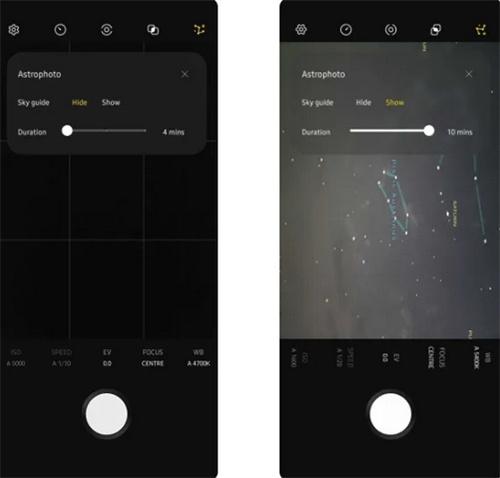 Expert RAW的天文攝影模式依靠長時間曝光拍攝來捕捉夜空中可見的恒星、行星和星座的高質(zhì)量圖像。此外,該應(yīng)用還具有內(nèi)置工具,可幫助用戶指向天空中的各種星座,允許用戶設(shè)置最長10分鐘的定時器。建議將設(shè)備安裝在三腳架上以拍攝穩(wěn)定的圖像。