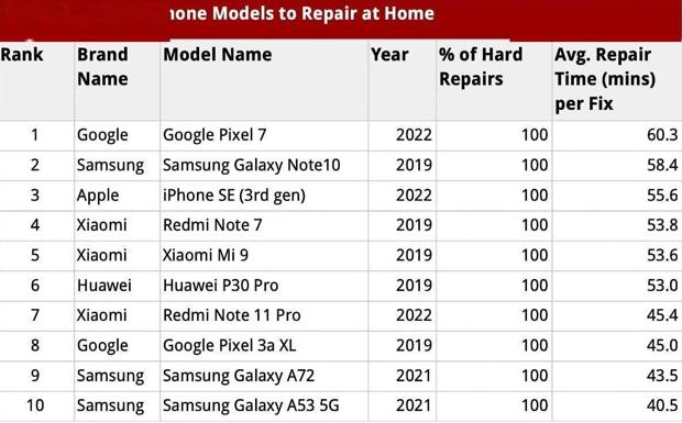 在這些智能手機中,谷歌Pixel 7成為了最難維修的智能手機之一,平均維修時間為60.3分鐘。雖然谷歌一向以設計簡潔、易用為賣點,但這款手機的維修確實是讓人望而生畏。