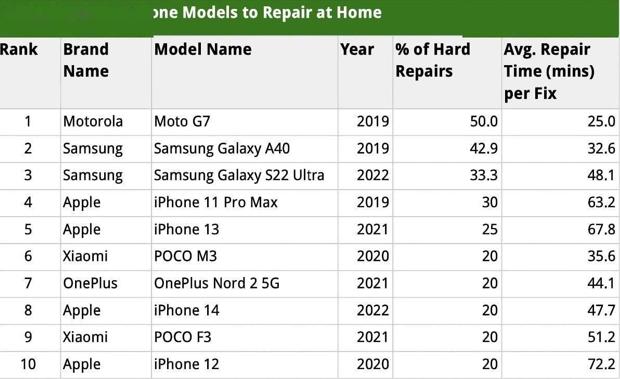 在最容易維修的前十款智能手機中,蘋果占比最大,共有4款iPhone上榜。排在第一位的是摩托羅拉Moto G7,平均修復時間為25分鐘,成為最易修復的智能手機。排在第二位的是Fairphone 3,它以自由軟件和可持續發展為目標,旨在推動可持續性的發展。排在第三位的是LG V20,它有著可拆卸電池和可更換部件的設計,成為了維修者們的最愛。蘋果在此榜單中的表現也十分亮眼,排在第四位的是iPhone 11 Pro Max,平均修復時間為63.2分鐘,排在第五位的是iPhone 13,為67.8分鐘,而排在第八位的是iPhone 14,修復時間為47.7分鐘,iPhone 12以72.2分鐘排在第十位。