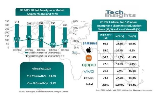 5月5日,TechInsights發布了2023年第一季度全球智能手機市場的出貨調查報告。根據該報告,全球智能手機市場在2023年第一季度同比下跌14%,至2.691億部。三星以22%的份額重回全球第一,蘋果以21%的份額緊隨其后。全球第三的小米份額為11%,接下來是OPPO和vivo,份額為10%和8%。