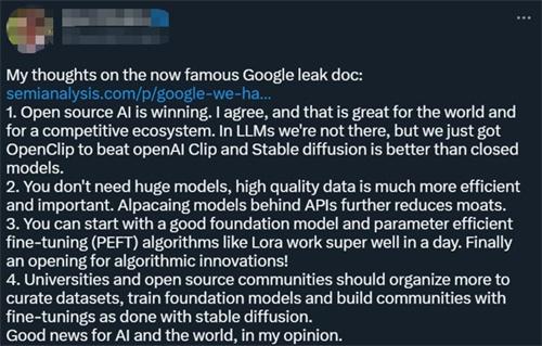 根據泄露的谷歌內部文件中可以看到,有一位內部研究員表示,雖然谷歌和open AI這兩家公司在AI領域互相追趕,很可能最終都沒辦法取得勝利,開源這一力量也在悄然的崛起。