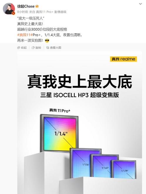 如何實現2億像素的高解析力以及無損變焦呢?一方面,可以采用2億像素的傳感器,另一方面,也需要考慮傳感器的尺寸。徐起透露,真我11 Pro+采用了三星HP3傳感器,尺寸為1/1.4英寸,是真我史上最大底的傳感器之一。相較于其他手機動輒1英寸左右的傳感器,1/1.4英寸的傳感器優勢顯而易見,可實現更高質量的影像表現。