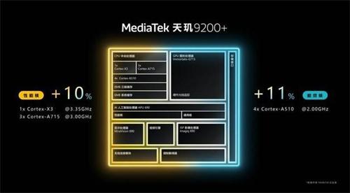聯發科推出的最新一代天璣9200+旗艦5G移動平臺,加強了性能,采用臺積電第二代4nm制程工藝,具備了八核CPU,包括1個主頻高達3.35GHz的Arm Cortex-X3超大核、3個主頻高達3.0GHz的Arm Cortex-A715大核和4個主頻為2.0GHz的Arm Cortex-A510能效核心,對比上一代的CPU性能有了明顯提升,性能核提升10%以上,能效核心提升了11%。此外,搭載的11核GPU Immortalis-G715峰值頻率提升可達17%。