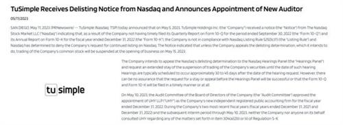 圖森未來所最后一次發布公司的業績報告是在去年10月份的時候,在今年3月份圖森未來表示要有更多的時間續聘會計師,所以無法按照原本既定的要求將2022年年度的報告提交出來,雖然已經被發放了退市稿件,但圖森未來也并不打算僅僅就此收手。上訴是必然的情況,就納斯達克宣布退市這一決定圖森未來也向聽證會的小組方面提出了要上訴,并且對于公司證券方面交易作出暫停,將交易期限延長一直到聽證會的當日。