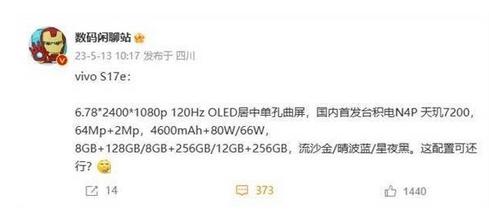 據(jù)數(shù)碼閑聊站博主透露,vivo S17e將推出,配備6.78英寸OLED屏幕和120Hz刷新率。該手機(jī)將首次搭載臺(tái)積電第二代4nm工藝的天璣7200處理器,包括2個(gè)2.8GHz Cortex-A715核心和6個(gè)2.0GHz Cortex-A510核心,以及Mali-G610 MC4 GPU。