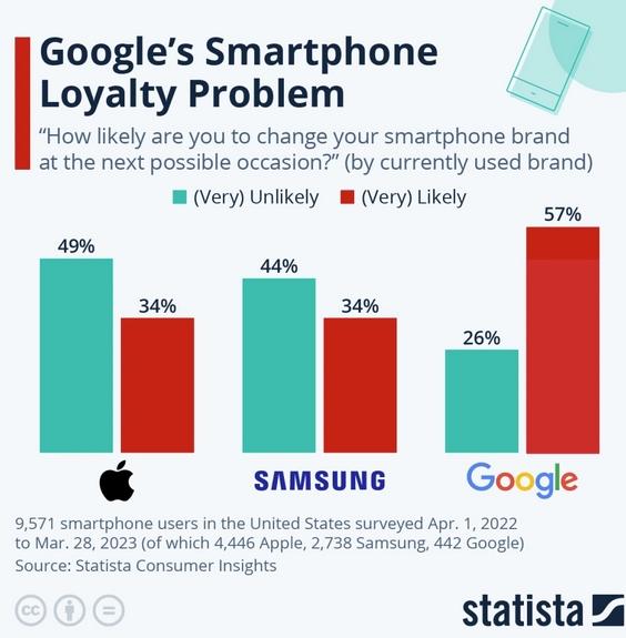 5月18日消息,根據(jù)市場(chǎng)調(diào)查機(jī)構(gòu)Statista發(fā)布的最新報(bào)告顯示,當(dāng)被問及“你下一款手機(jī)會(huì)選擇其他品牌嗎?”時(shí),49%的蘋果用戶表示他們將繼續(xù)選擇iPhone,而44%的三星用戶表示會(huì)繼續(xù)選擇Galaxy,而僅有26%的谷歌用戶表示會(huì)繼續(xù)使用Pixel。