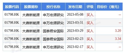 截至2023年5月17日收盤,大唐新能源 (01798.HK) 收盤價(jià)為3.07港元,下跌了0.65%,換手率為0.39%,成交量為982.83萬股,成交額為3046.23萬港元。該股被5家投行給予買入評級,近90天的目標(biāo)均價(jià)為3.27港元。申萬宏源研究最新一份研報(bào)也給予大唐新能源買入評級。