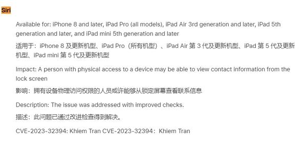 IT之家還在蘋果官方日志中發現了一個對用戶影響較大的漏洞,如果黑客能夠物理接觸到你的設備,他們可以在鎖屏界面下通過Siri漏洞來查看你的聯系人信息。