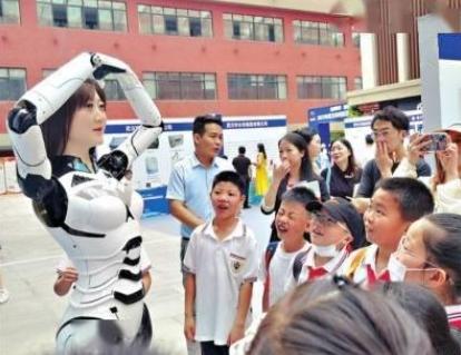 在活動(dòng)現(xiàn)場(chǎng),北京清博智能科技有限公司武漢分公司展示了一款高科技產(chǎn)品——一個(gè)與真人一模一樣的仿真女性人形機(jī)器人。這個(gè)機(jī)器人擁有硅膠臉和黃頭發(fā),通過(guò)技術(shù)人員的指令,它可以挑眉眨眼,手舞足蹈,向人們介紹自己,甚至還向小學(xué)生們抬起手臂比心,引起了全場(chǎng)觀眾的歡呼和鼓掌。