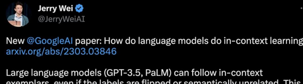 上下文的學習是一種學習的過程,對沒有見過的樣品進行評估,執行具體的任務前會對于輸入的標簽先接收并對應,語言模型上下文在學習方面產生的能力會跟隨參數的變化而出現相應的改變。大型大語言模型遵循上下文當中給出的范例,即使標簽與意義上并沒有相關聯的特點或者被翻轉,這樣的能力在小型的語言模型當中是根本不存在的現象。