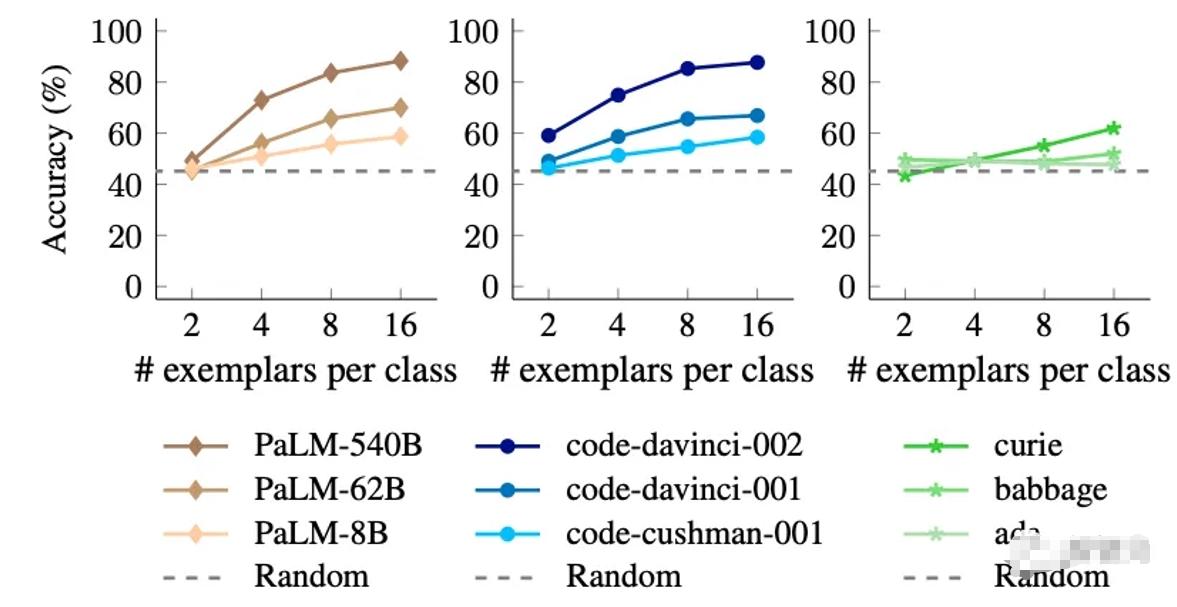 研究人員在做實驗的時候,利用語義無關的標簽,將原本的標簽作為替代,在進行這種替換之后,語義無關的標簽,使得小型模型性能方面有較大幅度的下降, 而當語義標簽所具有的特性被移除掉之后,大模型可以在上下文當中對輸入標簽映射的能力具備相比于小型模型來說,上下文的范例對于大模型在使用性能上面改善是很大的。