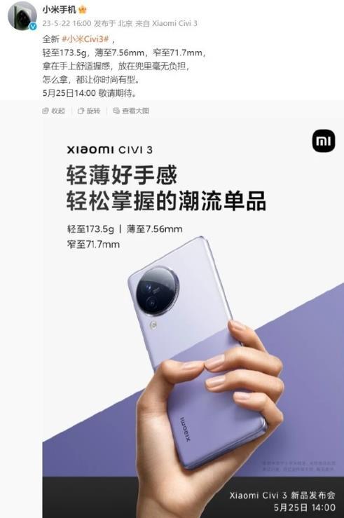 小米手機官方微博宣布,小米Civi 3即將于5月25日發布,并搭載聯發科天璣8200-Ultra芯片。這款手機的重量僅為173.5克,厚度為7.56毫米,寬度為71.7毫米,非常適合單手握持。此外,它還搭載了一顆50MP的主相機,提供出色的拍攝能力。