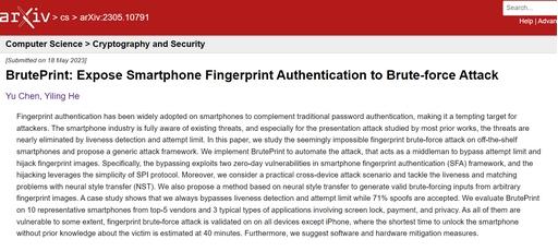 近日,騰訊安全玄武實驗室與浙江大學的研究人員在論文《BrutePrint:暴露智能手機指紋認證的暴力攻擊》中,揭示了一種新的針對安卓和鴻蒙手機指紋識別的攻擊方法。
