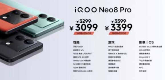 在售價方面,iQOO Neo8 Pro提供了兩個版本可供選擇:16GB+256GB版本售價為3299元(首銷價為3099元),16GB+512GB版本售價為3599元(首銷價為3399元)。而iQOO Neo8則提供了三個版本:12GB+256GB版本售價為2499元(首銷價為2299元),16GB+256GB版本售價為2799元(首銷價為2599元),16GB+512GB版本售價為3099元(首銷價為2899元)。