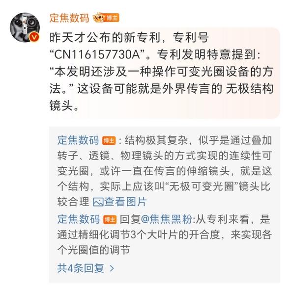 根據數碼博主@數碼閑聊站和@定焦數碼的預測,這可能是華為的“無極結構鏡頭”,之前只支持10檔調節,而新技術有望實現無級調節光圈,并采用伸縮式堆疊的設計。