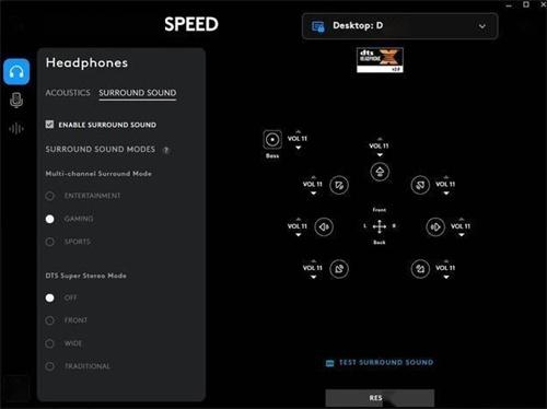 在音頻控制方面,羅技在Pro X 2上采用了DTS環(huán)繞音頻,而不是微軟的Windows Sonic環(huán)繞音效,這無疑受到了用戶的歡迎。你可以選擇多聲道環(huán)繞模式,優(yōu)化游戲、娛樂或體育體驗(yàn),并對每個(gè)虛擬環(huán)繞聲元素進(jìn)行單獨(dú)控制,還有整體低音水平的調(diào)節(jié)。